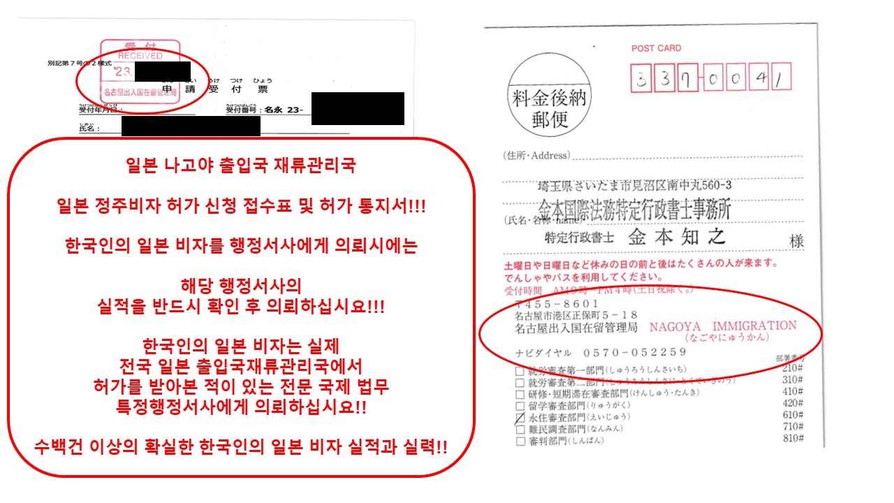 당행정서사가 일본 나고야 출입국재류관리국에 일본 정주비자 신청을 접수하여 실제 허가를 받은 허가 엽서입니다.