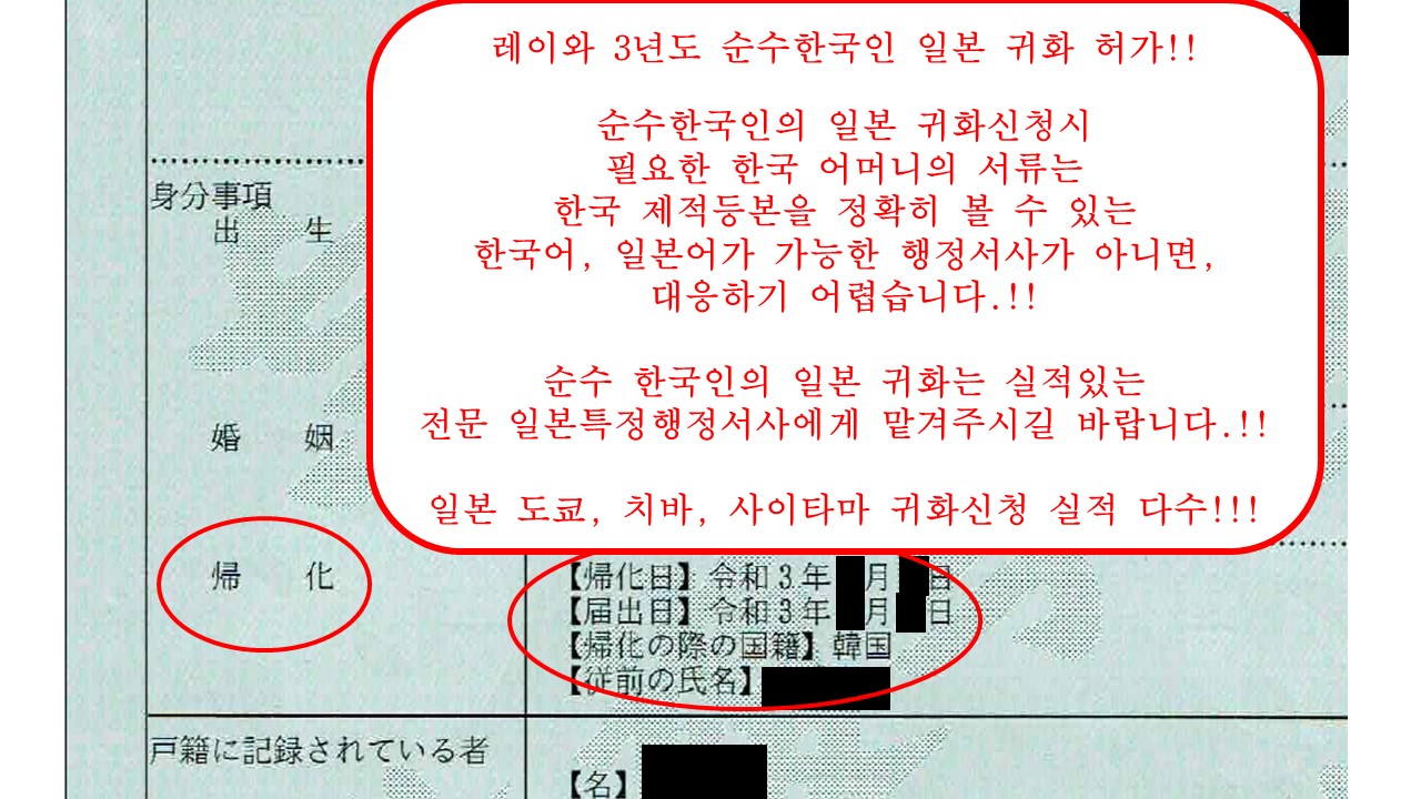 특히, 순수한국인의 일본 귀화업무는 한국에서 준비해야 하는 어머니의 서류문제가 만만치 않으므로, 귀화업무를 행정서사에게 의뢰하실 때에는, 한국인의 일본귀화와 관련해서, 한국인의 제적등본을 제대로 볼 수 있는지, 신술서와 번역문에 대해서도 대응할 수 있는지 반드시 확인하고 의뢰하시길 바랍니다.