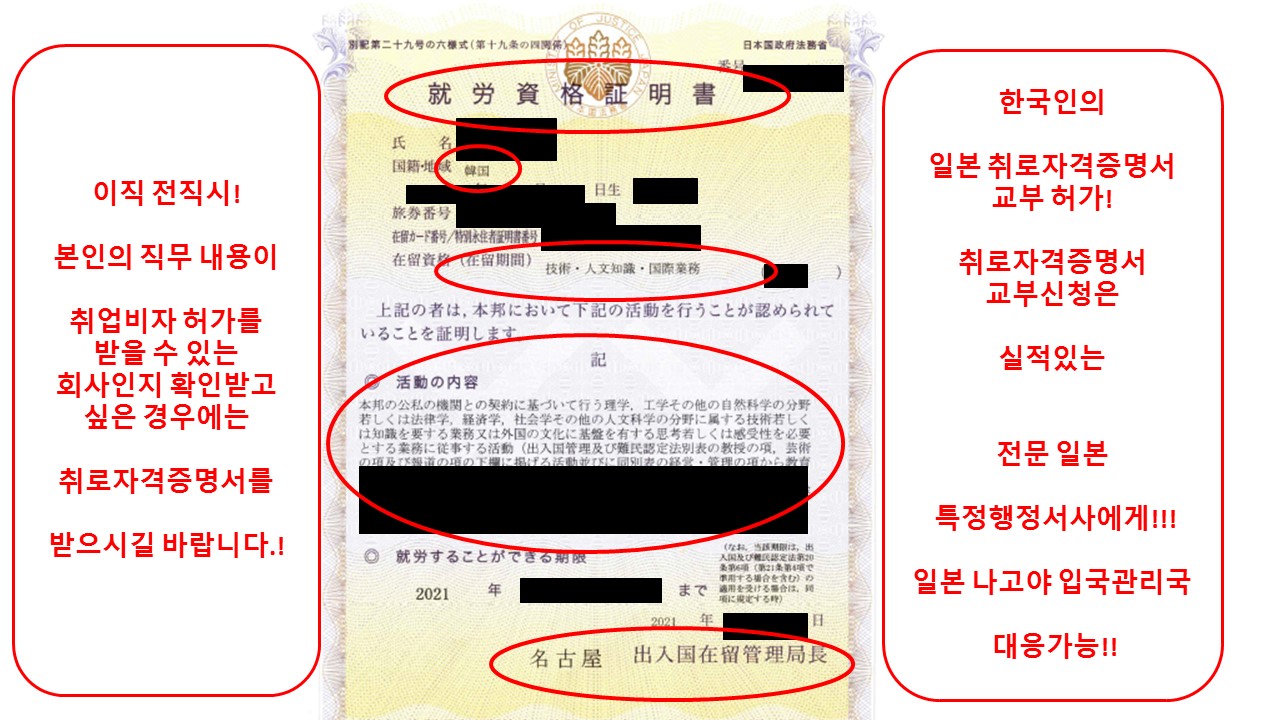 당행정서사가 2021년 올해, 나고야 출입국재류관리국장으로부터 허가 받은 한국분의 취로자격증명서입니다.!!