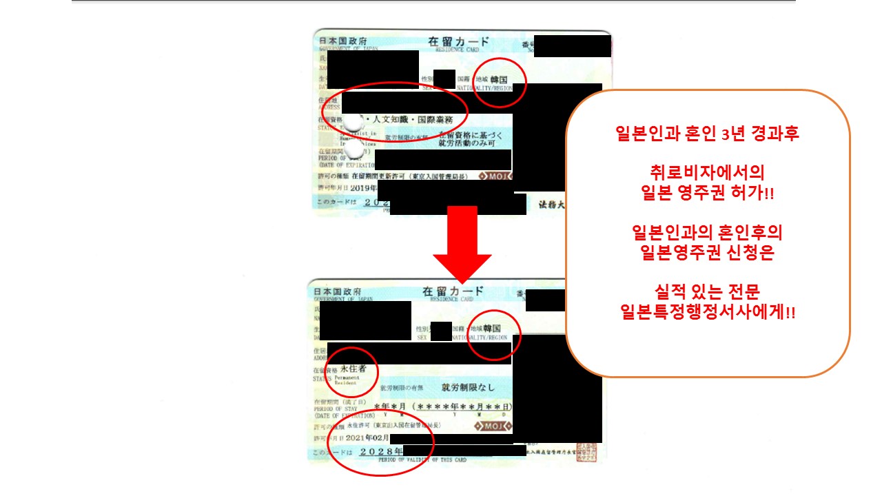 | 일본 정주비자에서 일본 영주권 신청시의 주의점!!! 일본 정주비자에서 영주권 신청은 실적있는 전문 일본 특정행정서사에게!! (0) | 2021.10.24 |