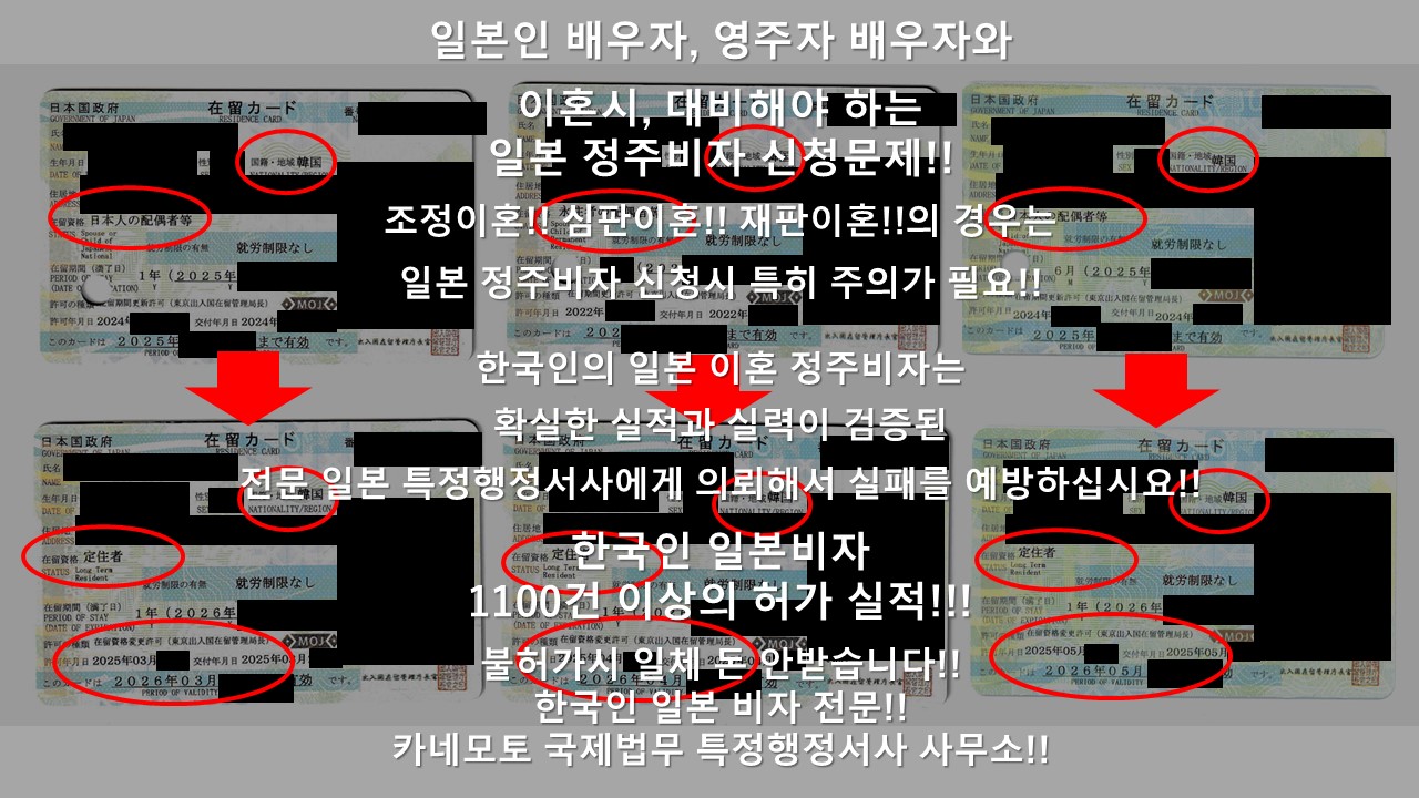 일본인과의 협의이혼, 한국인끼리의 조정이혼, 일본인과의 재판이혼 후, 허가를 받은 일본 이혼 정주자비자입니다!!