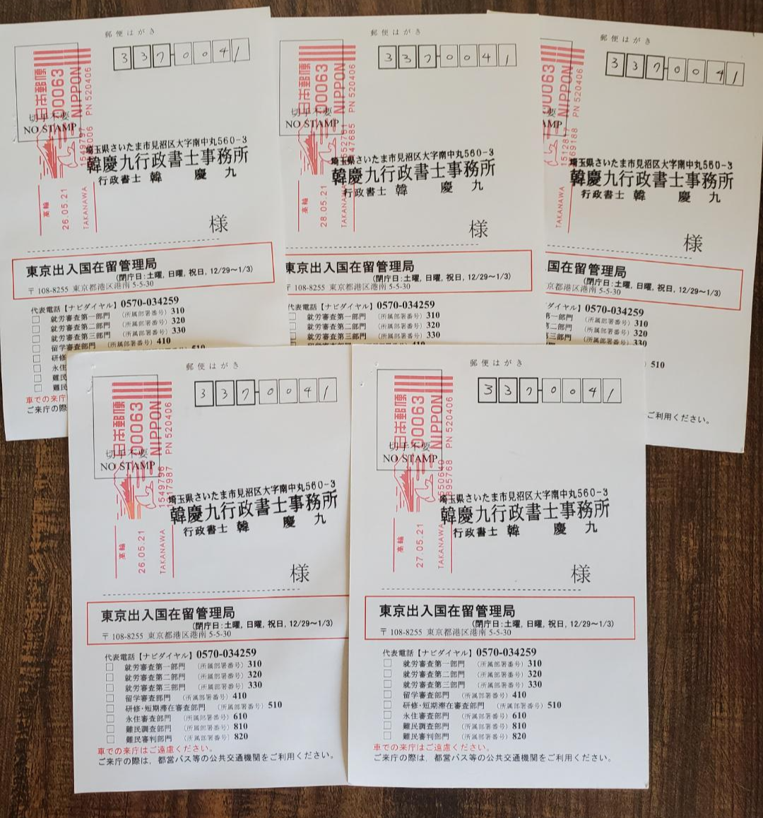 2021년 5월 마지막주에 당행정서사에게 통지된 도쿄출입국 재류관리국의 허가 엽서입니다.