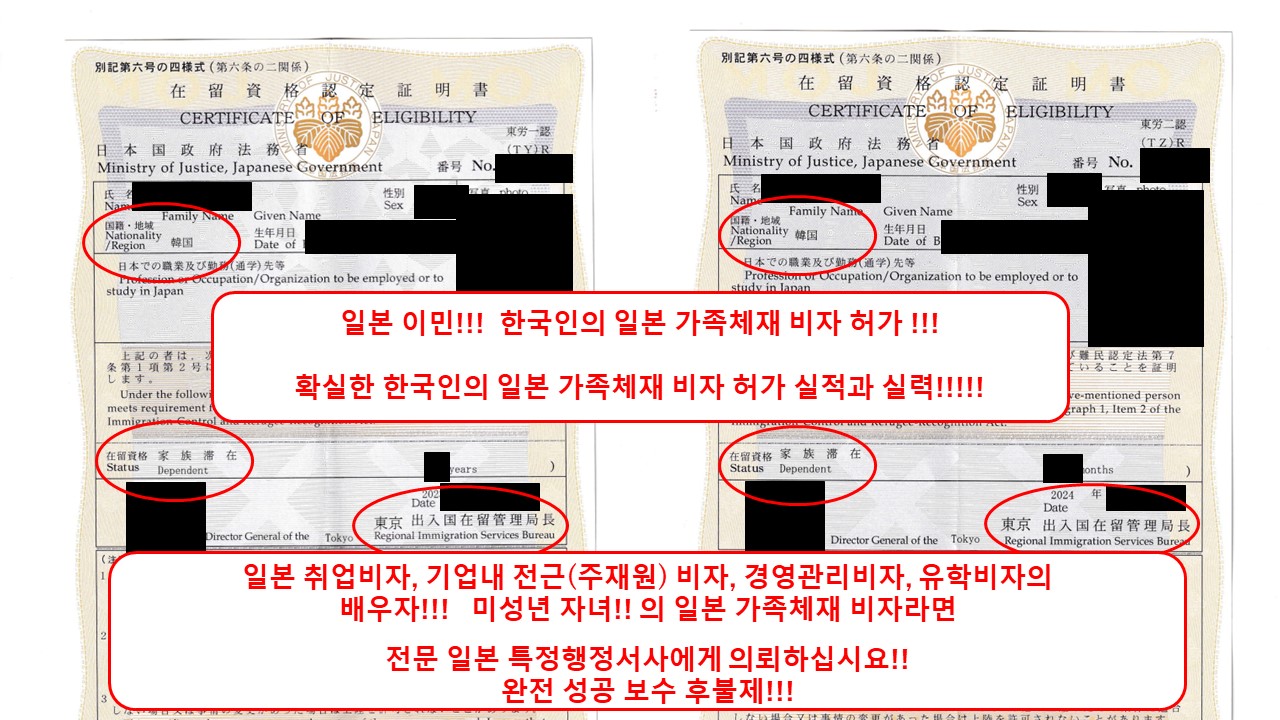 일본 취업비자, 일본 기업내 전근비자(주재원 비자), 경영관리비자, 유학비자의 배우자, 미성년 자녀의 일본 가족체재 비자는 확실한 실적과 실력이 있는 전문 국제 법무 특정행정서사에게 의뢰하십시요.!