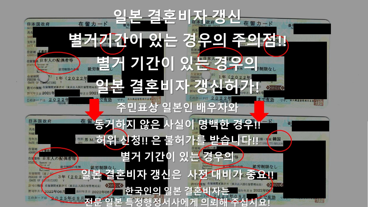 만약 주민표상 별거사실이 분명한 경우에 있어서, 납득할 수 있는 사유를 설명하지 못할 경우, 일본 결혼비자는 취소될 수 있으며, 일본 결혼비자 갱신은 불허가를 받게됩니다.