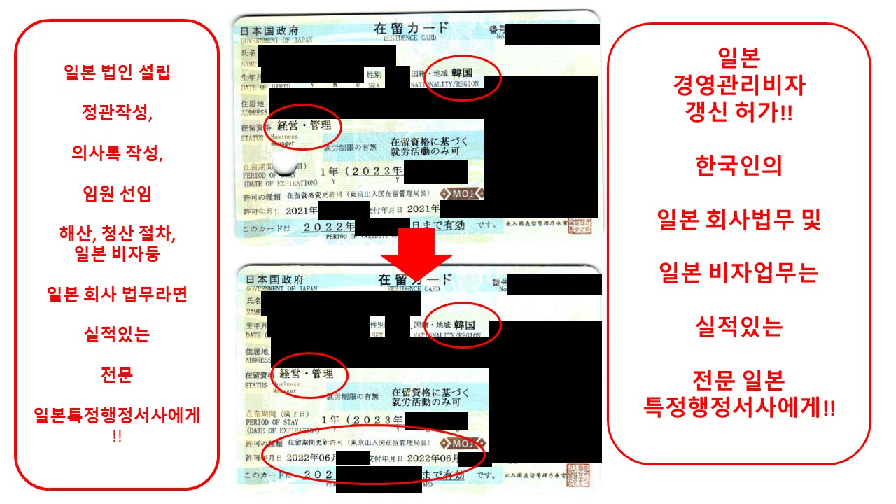 한국인의 일본 경영관리비자와 회사 경영에 필요한 회사법무라면, 실적있는 전문 일본 특정행정서사에게 맡겨주시길 바랍니다. (페이퍼 컴패니등, 불법적인 사업체는 업무 수임 불가.)
