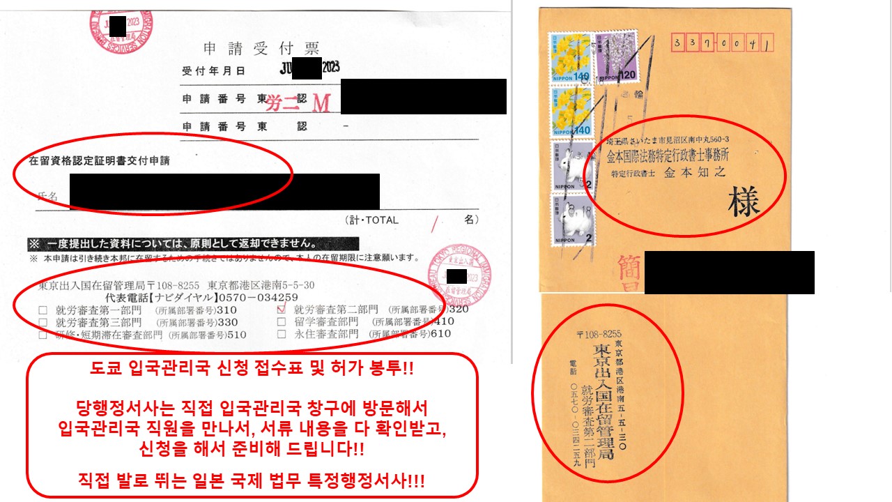 당행정서사가 도쿄출입국재류관리국에 경영관리비자 신청을 했을 때의 신청 접수표와 허가를 받은 허가봉투입니다.