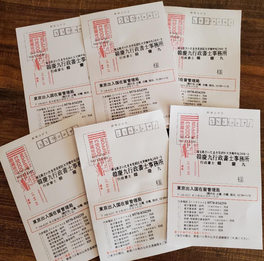 2021년 9월 마지막주에 당행정서사에게 통지된 도쿄입국관리국의 한국 고객분의 허가 엽서 6통입니다.!!