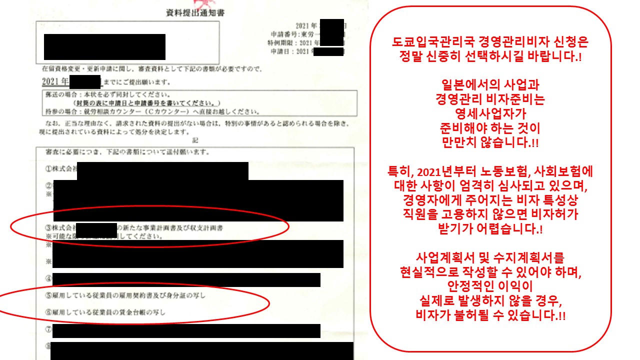 ◆ 일본 경영관리비자는 갱신시에 생각지도 못한 추가서류 제출을 요청받을 수 있습니다.