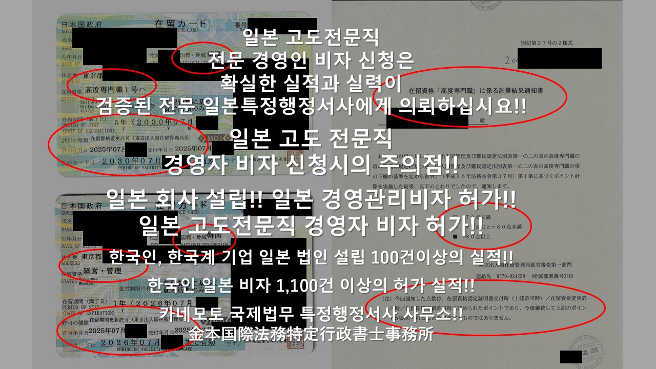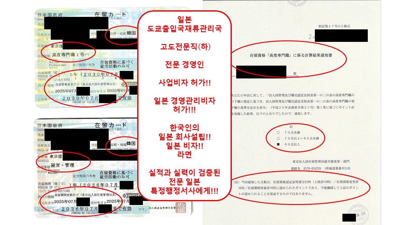◆ 한국인의 일본 경영관리비자, 고도전문직 경영자 비자라면 확실한 실적과 실력이 검증된 전문 일본 특정행정서사에게 의뢰하십시요!!(2025년 7월 기준 한국인 일본비자 1100건 이상의 허가실적!!)