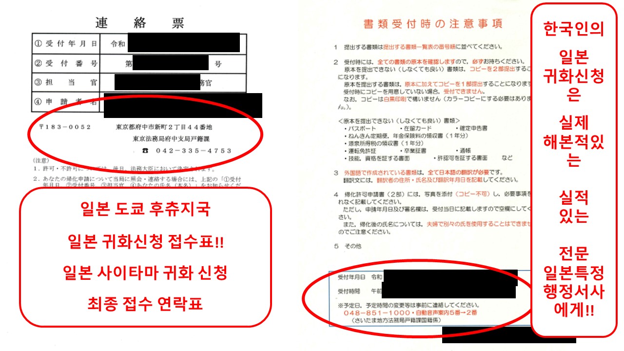 일본 도쿄 후츄지국에서 접수된 귀화허가 접수표와, 사이타마 지방법무국의 최종 귀화 신청 접수 안내 자료입니다.