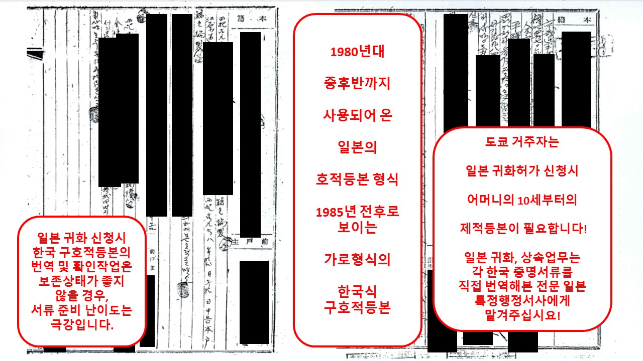 일본인으로 귀화를 생각했다가 포기하게 되는 가장 많은 이유가 어려운 한국 어머니의 서류 수집과, 일반인은 보기 어려운 모순없는 구호적등본 수집 및 번역 작업에 있습니다.