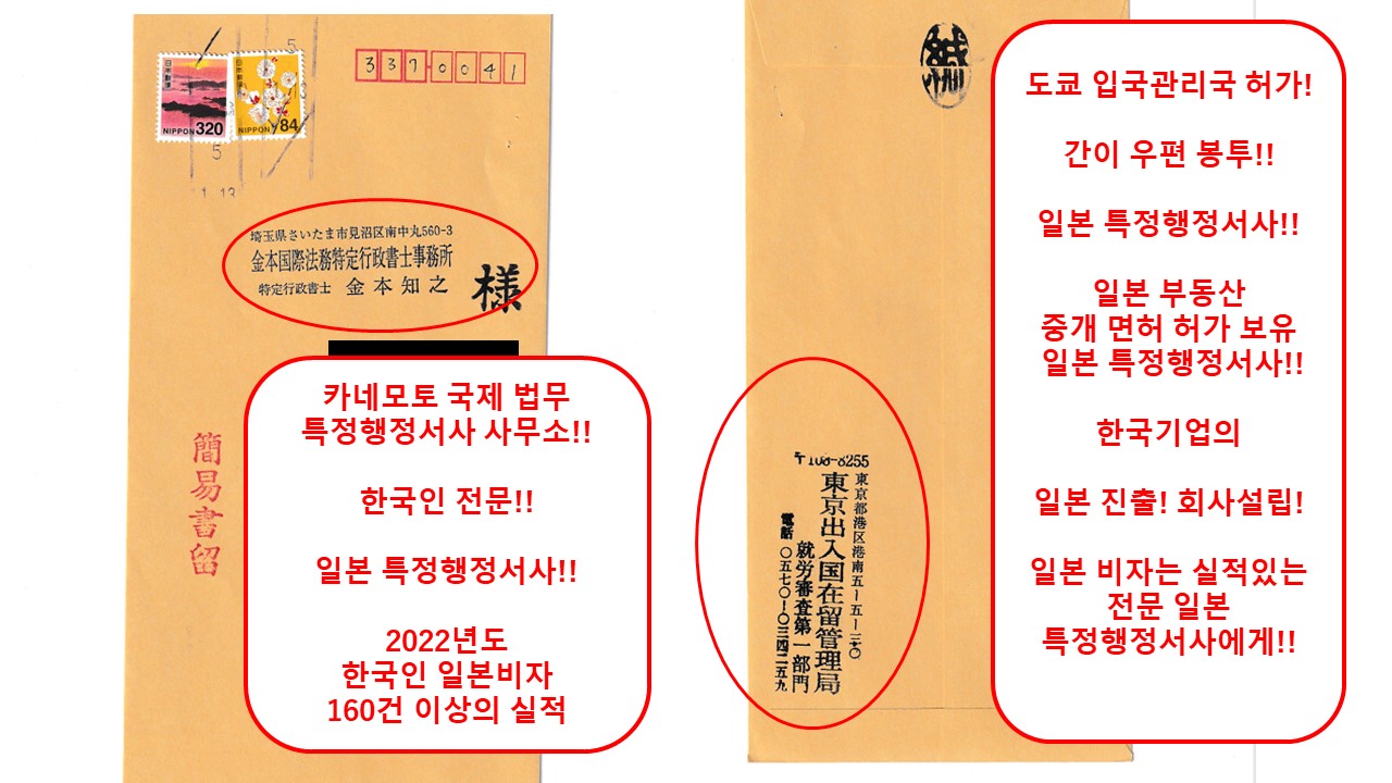 당행정서사에게 도쿄 출입국재류관리국 취로심사과로부터 통지된 허가 봉투입니다. 일본 국적 취득후(일본 귀화후)의 사무소 명칭인 " 카네모토 국제법무 특정행정서사 사무소"로 송부되었으며, 연말연시휴일을 포함하여, 약 1달의 심사를 거쳐서 허가를 받았습니다. 한국 기업의 일본 진출, 일본 회사 설립, 직원의 일본 비자라면, 실적있는전문 일본 특정행정서사에게 의뢰하시길 바랍니다!! (일본 비자업무는 행정서사 시험에 합격한 정도만으로는 하기 어려운 업무입니다. 일본 비자 업무를 행정서사에게 의뢰할 때에는 해당 행정서사의 실적을 반드시 확인하고 의뢰하시길 바랍니다.)
