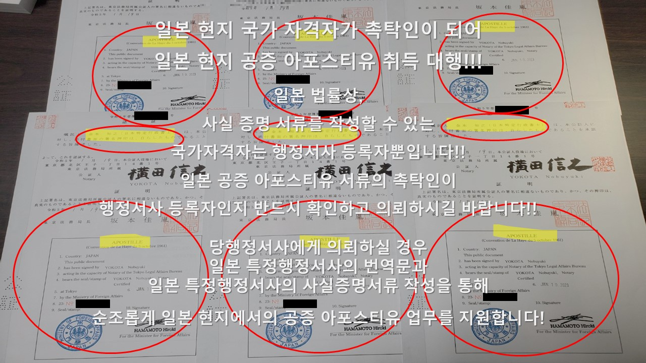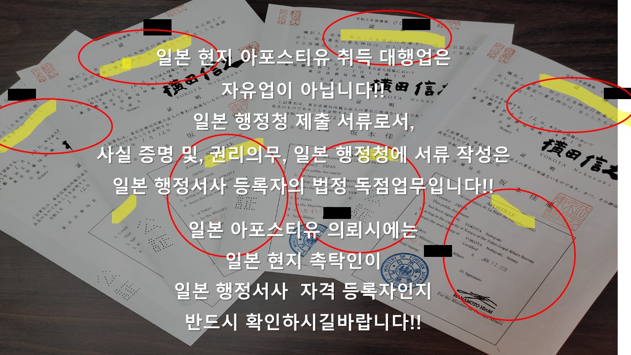 일본에서 행정청에 해당하는 지정공증사무소, 외무성에 제출하는 서류의 작성 및 대리절차는 일본 법률상, 행정서사 자격등록자가 아니면 할 수 없는 업무입니다. 일본 아포스티유를 대행업자에게 의뢰할 때에는 해당 대행업자가 일본 행정서사등록자인지 반드시 확인 후 의뢰하시길 바랍니다.