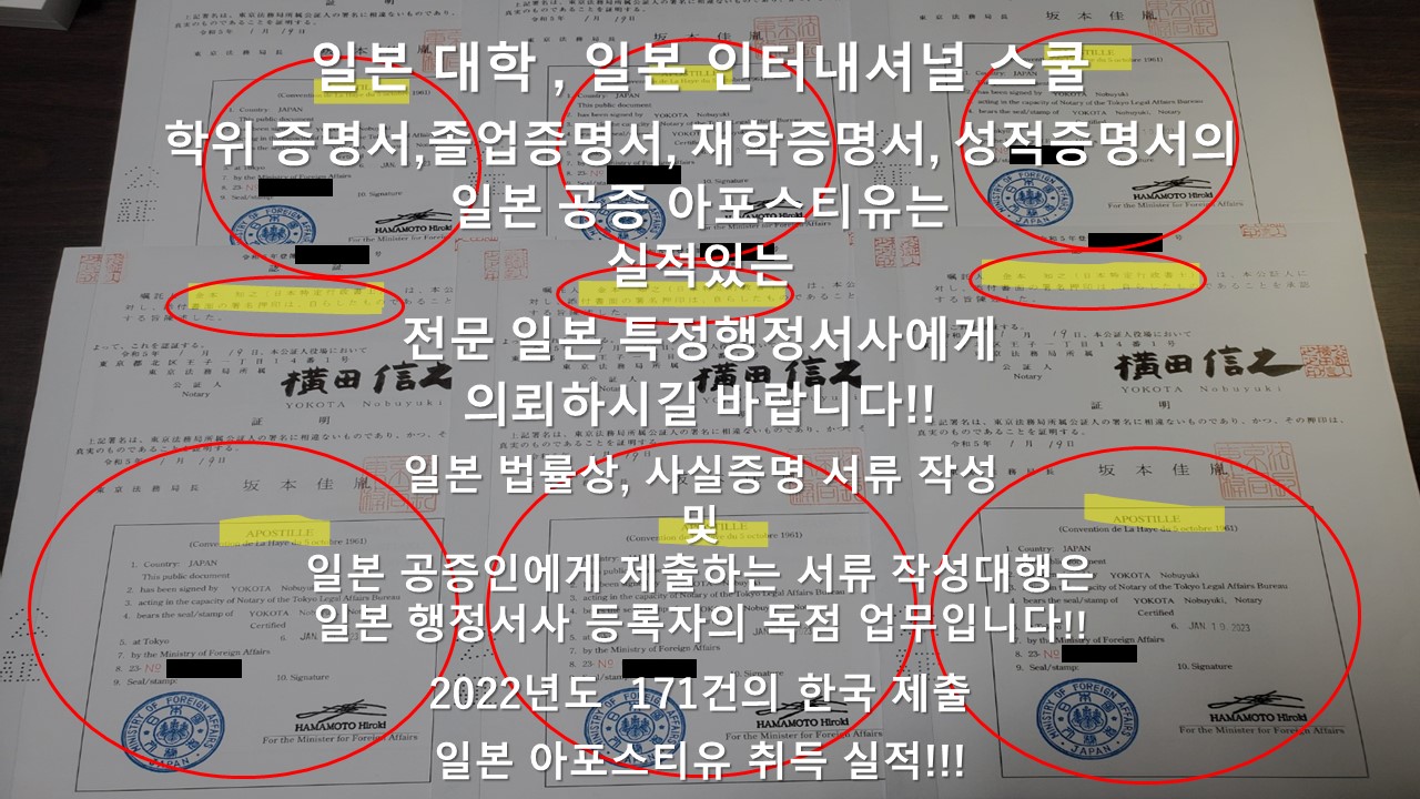 당행정서사의 일본 행정서사 등록번호는 16130910호 이며, 2022년도에 한국에 제출하는 일본 아포스티유 171건을 취득한 실적이 있는 아포스티유 전문 일본 특정행정서사입니다!!!
