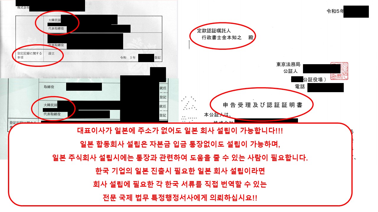 ◆한국인, 한국법인의 일본 법인 설립시에는 한국 서류를 모두 번역해서 준비해야 하며, 이 업무는 실제 업무를 해본적 없는 일본 행정서사, 사법서사일 경우, 대응이 어려운 업무입니다.