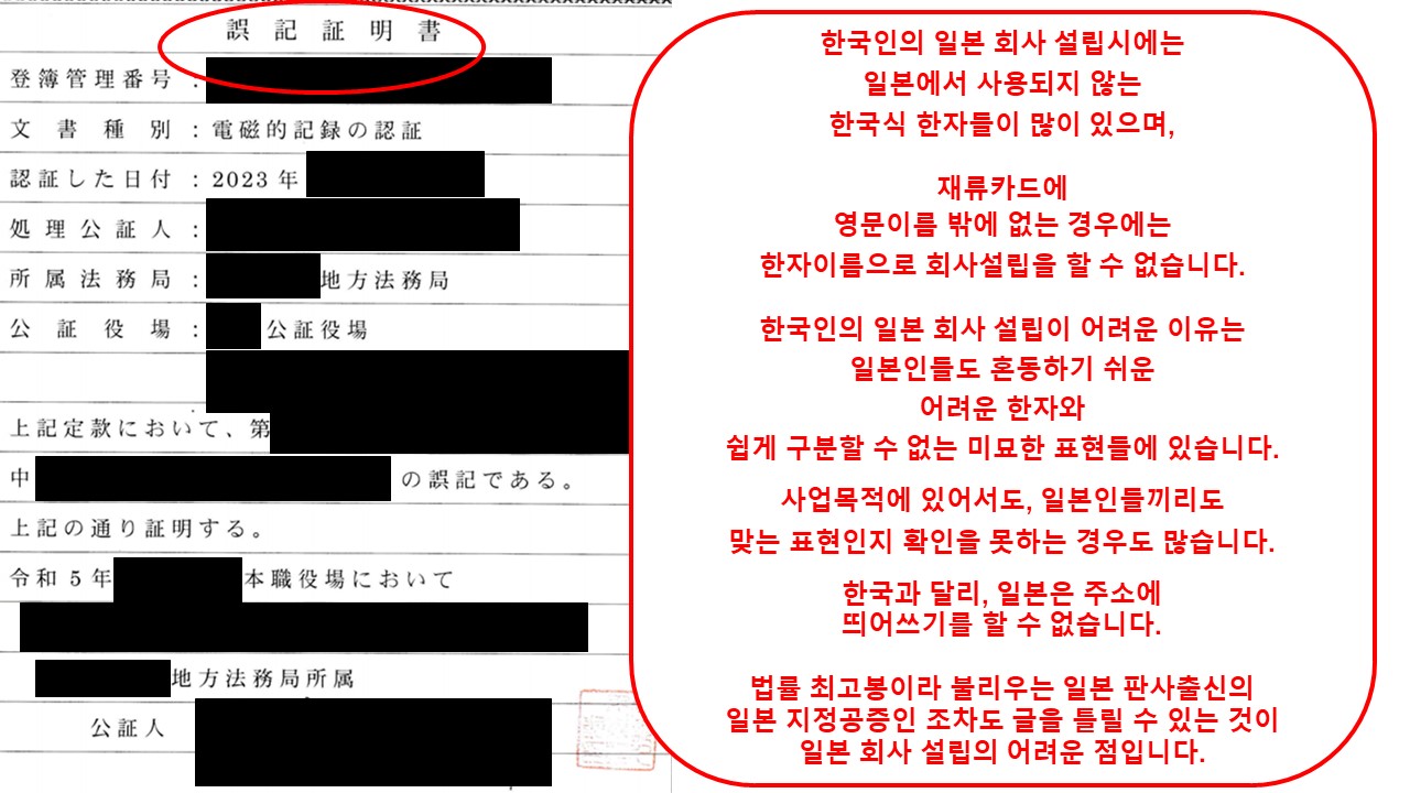 주식회사 설립시에는 정관에 대한 공증인의 공증을 받아야 합니다. 한국인, 한국법인의 일본 법인 설립시에는 일본에서 사용되지 않는 한국식 한자들이 많이 있으며, 재류카드상에 영문 이름밖에 없을 경우에는, 한자이름으로 회사 설립을 할 수 없고, 카타카나로만 설립이 가능합니다.