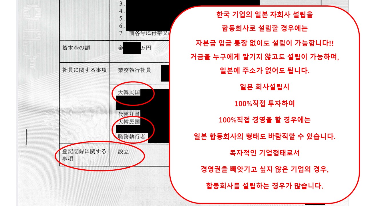 한국 기업이 일본 자회사 설립을 합동회사로 할 경우에는, 자본금 입금 통장 없이도 설립이 가능합니다. 즉, 합동회사 설립시에는 자본금에 해당하는 거금을 제3자의 통장에 입금하지 않고도 설립이 가능하기 때문에, 자본금 입금을 타인의 개인 통장에 해야 하는 리스크를 줄일 수 있습니다.