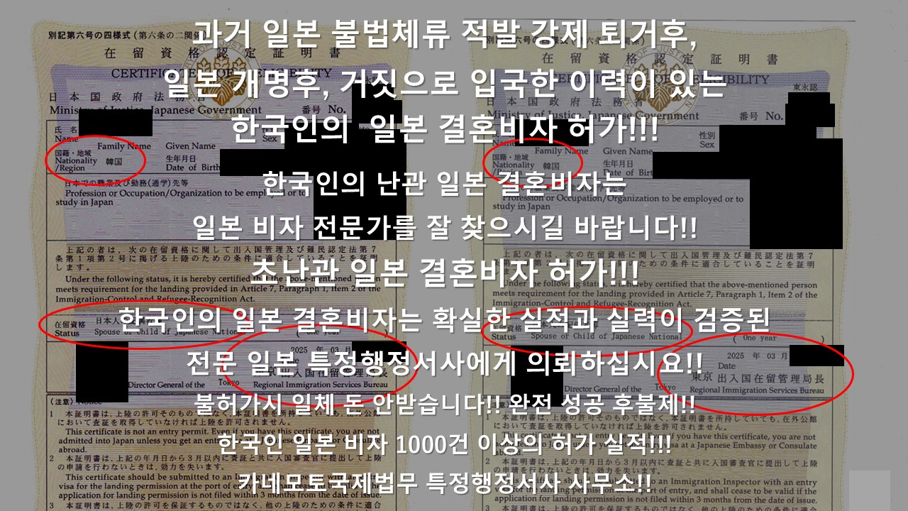 한국인 일본 비자 허가 실적 1000건 이상!!! 초난관 일본 결혼비자 허가 실적 다수!!!