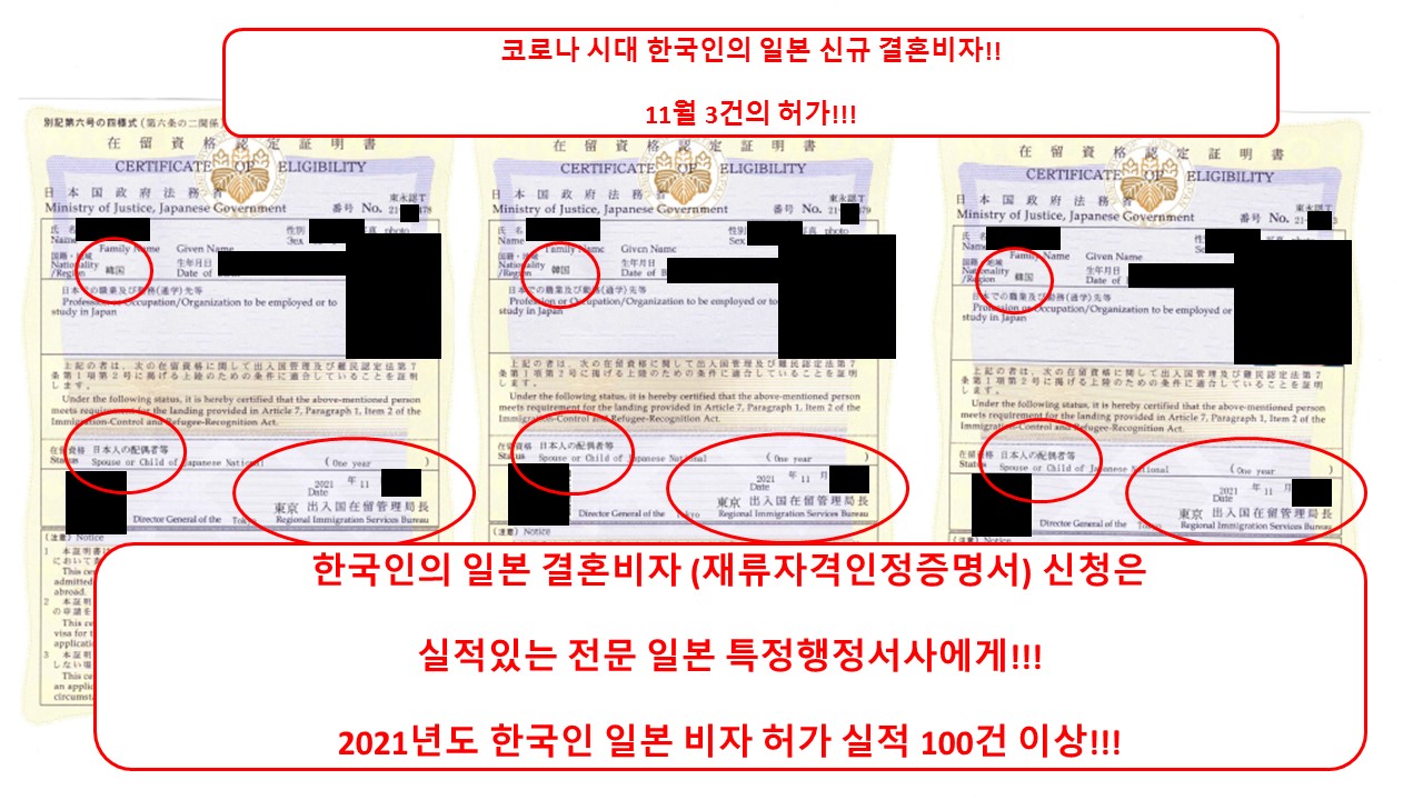 당행정서사는 2021년 11월에 총 4건의 한국분의 일본 결혼비자 허가를 받았습니다.!!