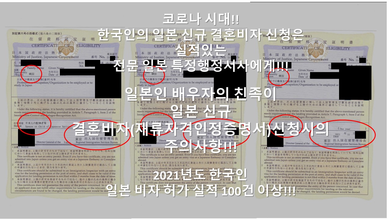 한국분의 일본 신규 결혼비자 재류자격인정증명서 허가 3건(난관 결혼비자 변경신청안건 1건 포함 총 4건 허가)을