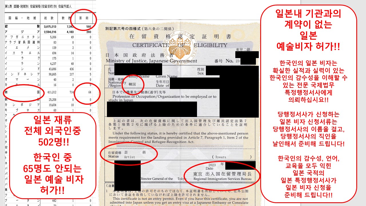 ◆일본 예술비자는 전체 한국인 중 재류하는 한국인이 소수이며, 희소성이 있는 재류자격입니다.
