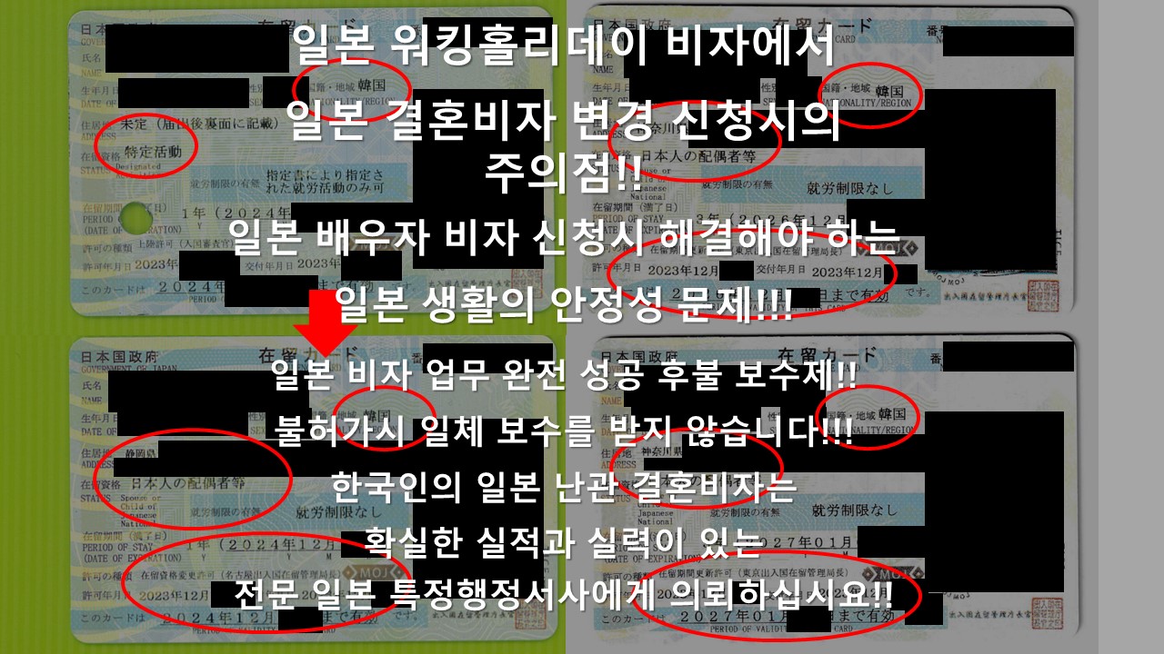 워킹홀리데이 비자에서 일본 결혼비자 변경 허가를 받았으며, 안정적인 직장이 없는 상태로, 신청을 하였습니다만, 사전에 당행정서사가 청취한 내용을 바탕으로 약 3개월 가까운 준비를 하여 허가를 받았습니다.