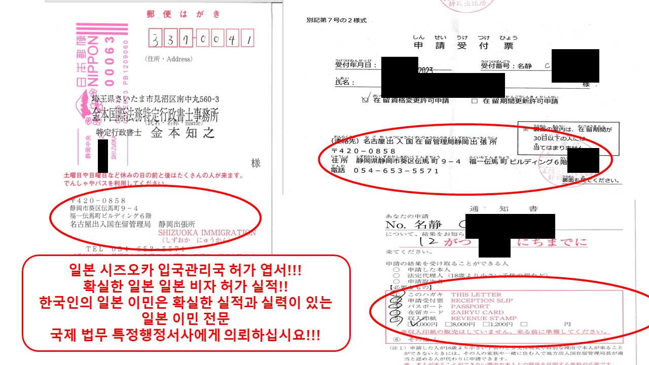 당행정서사가 시즈오카 입국관리국에서 허가를 받은 허가 엽서입니다! 한국인의 난관 일본 결혼비자라면 확실한 실적과 실력이 있는 전문 일본 특정행정서사에게 의뢰하십시요!! 당행정서사가 일본 결혼비자 신청을 할 경우, 작성해 드리는 결혼비자 신청이유서는 최소 6장~8장이며, 당 행정서사의 이름을 기재하고, 직인을 날인해서, 신청을 해드립니다!!