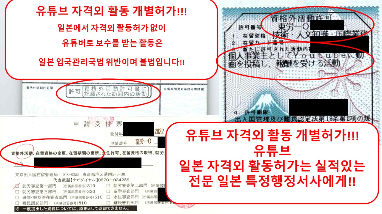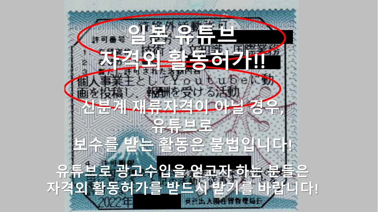 "자격외 활동 허가를 받지 않고, 보수를 받는 일본내 유튜브 광고수입은 일본 출입국재류 관리국법" 위반이 될 수 있음을