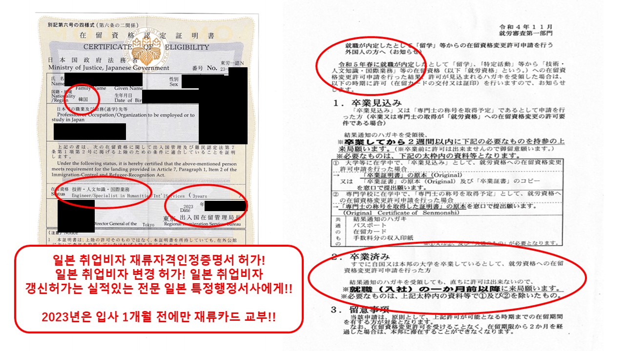 ◆내정이 확정되었다면, 졸업증명서가 있을 경우, 일본 대학뿐만 아니라, 한국 대학 졸업예정자도 취업비자 변경신청이 가능합니다.