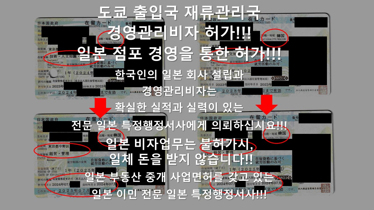 한국인 및 한국 기업의 일본 법인 설립 및 경영관리비자, 직원들의 취업비자, 주재원 비자 허가까지 확실히 허가를 받아본 적이 있는 전문 일본 특정행정서사에게 의뢰하십시요!!