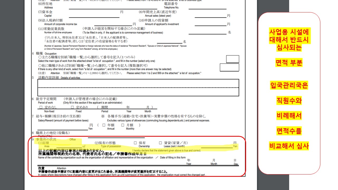 경영관리비자 신청은, 사업소에 대해서 반드시 심사가 됩니다. 신청서에도 면적을 비롯해서 소유물건인지, 임차물건인지 반드시 기재하도록 되어 있으며, 경영관리비자는 경영활동을 수행해야 허가를 받을 수 있는 비자로서, 직원을 고용해서, 경영관리 활동을 하고 있다는 것을 입증해야 합니다.