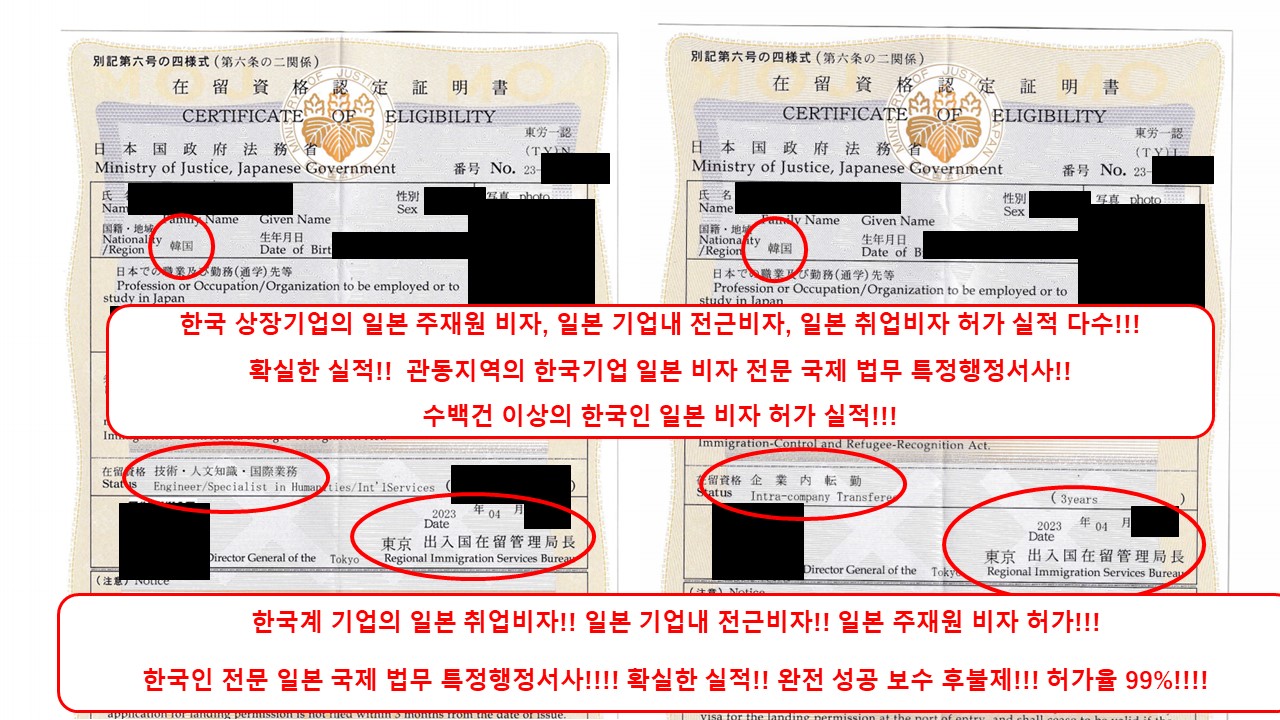 한국기업의 일본 취업비자와 일본 주재원 비자, 일본 기업내 전근비자는 확실한 실적이 있는 일본 국제 법무 특정행정서사에게 의뢰하시길 바랍니다.!! (한국 상장기업등 한국 기업의 확실한 일본 비자 허가 실적!!, 완전 성공 후불 보수제도!!)
