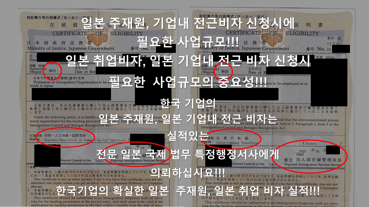 ◆한국기업의 일본 주재원 비자, 기업내 전근비자, 일본 취업비자는 사업규모가 심사됩니다.