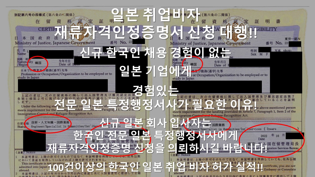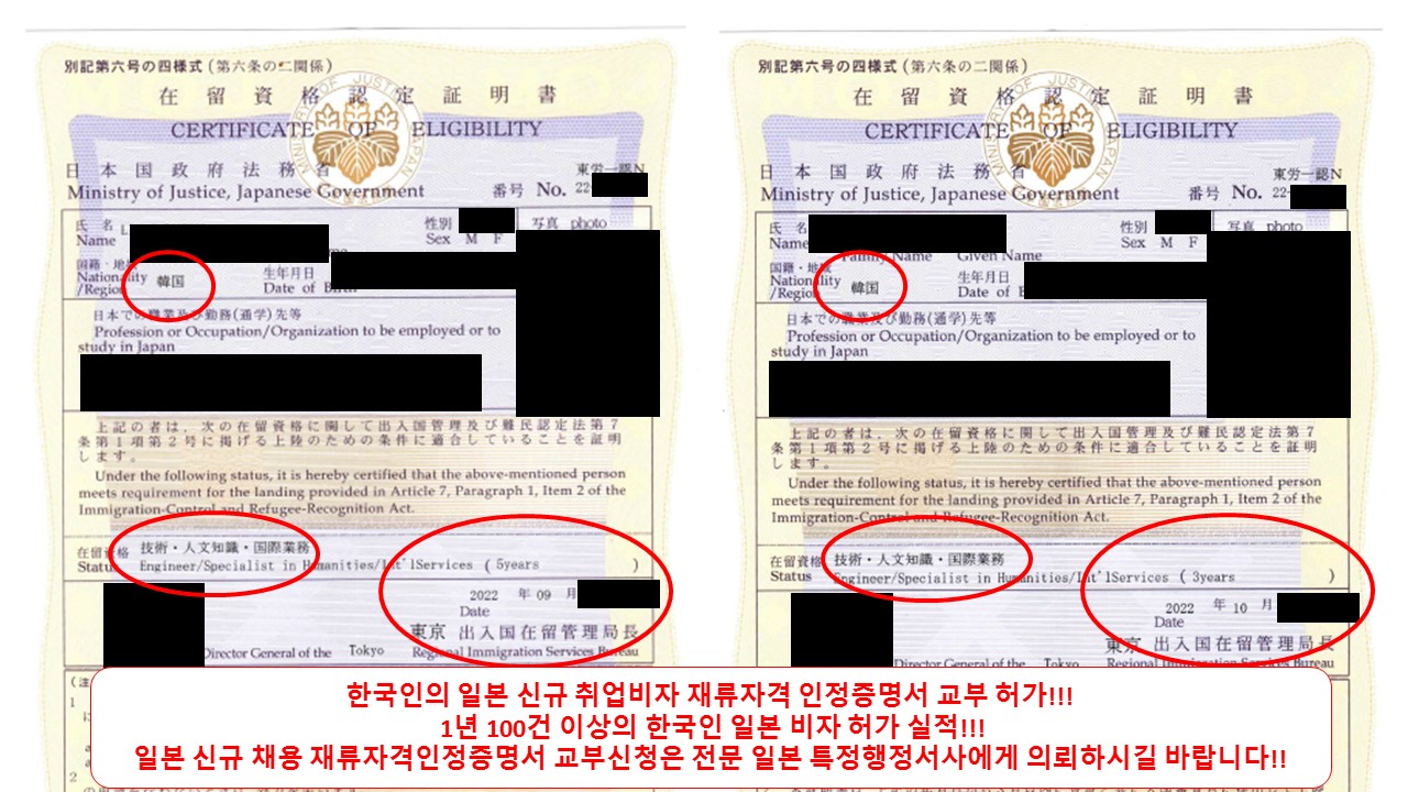 ◆한국인의 일본 취업비자라면, 실제 한국인의 일본 취업비자 허가를 받아본 전문 일본 특정행정서사에게 맡겨주시길 바랍니다.!(2022년 10월 기준, 2022년도 한국인 일본비자 135건의 실적!!!)