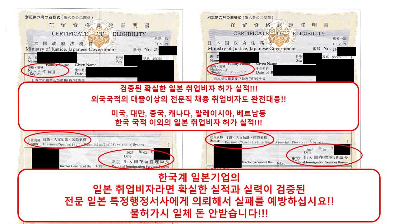 한국!! 미국!! 대만!! 캐나다!! 베트남!! 말레이시아!! 중국등 한국 이외 국적자의 일본 취업비자 허가 실적 다수!!!