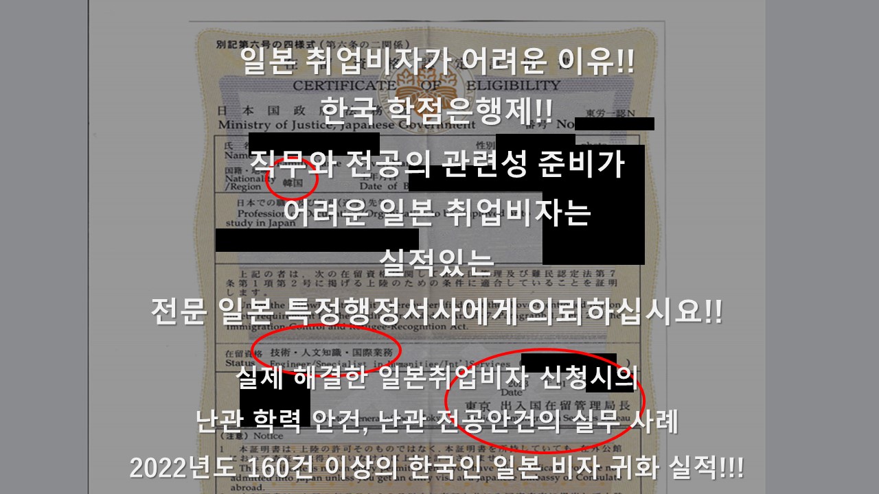한국인의 학점은행제 출신의 안건, 전공과 직무와의 관련성 설명이 어려운 일본 취업비자라면 실적있는 전문 일본특정행정서사에게 맡겨주시길 바랍니다! 직접 일본 현지에서 일본 기업의 인사담당자님께 연락해서, 일본 취업비자를 준비해 드립니다.!(2022년도 160건 이상의 한국인 일본 비자, 귀화 실적!!!)