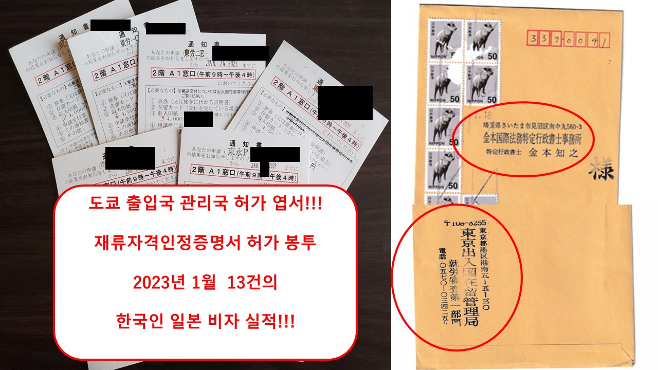 2023년 1월 첫째주에 당행정서사에게 통지된 허가엽서와 허가 봉투입니다.!!! 온라인 신청이 활성화 되고 있다고 하지만, 일본 입국관리국의 심사운용을 고려하여, 당 행정서사는 온라인 신청을 하지 않고, 직접 일본 입국관리국에 가서, 서류 확인, 교섭등의 방법으로 일본 비자 신청을 지원해 드립니다!!