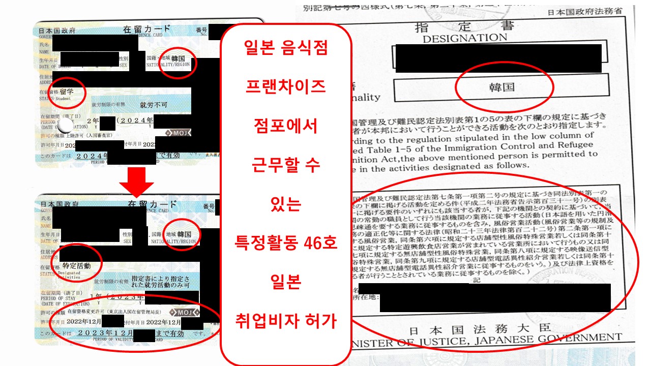 당행정서사가 대행을 해서 허가를 받은 일본 음식점, 프랜차이즈 레스토랑, 홀 서빙, 주방에서 근무할 수 있는 일본 특정활동비자(46호 허가)비자입니다. 유학비자에서 특정활동비자(46호)로 변경허가를 받았으며,