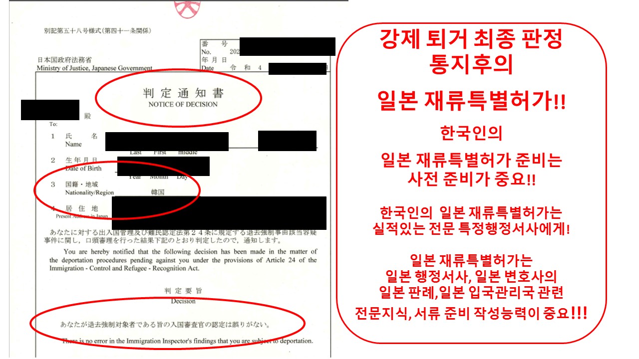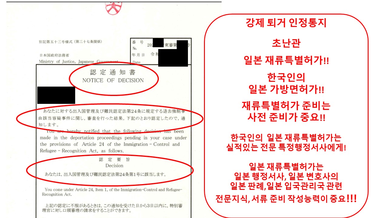재류특별허가는 이러한 강제퇴거라는 문구가 기입된 인정서, 판정서, 입국관리국의 전화에 대해서도