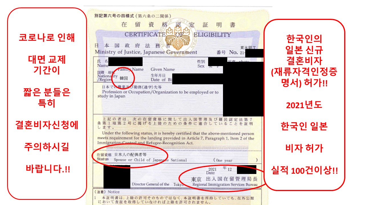 당행정서사가 2021년 12월 도쿄 출입국재류관리국으로부터 허가 받은 재류자격"일본인의 배우자등" 재류자격인정증명서 입니다.!! 당행정서사의 조언대로, 한국에서 필요한 서류와 일본에서 필요한 서류를 분류 작업하여 서류를 준비해 주신 고객님께 대단히 감사합니다. 고객님과의 상호 신뢰를 바탕으로 한, 협조로, 순조롭게 허가를 받을 수 있었습니다.!
