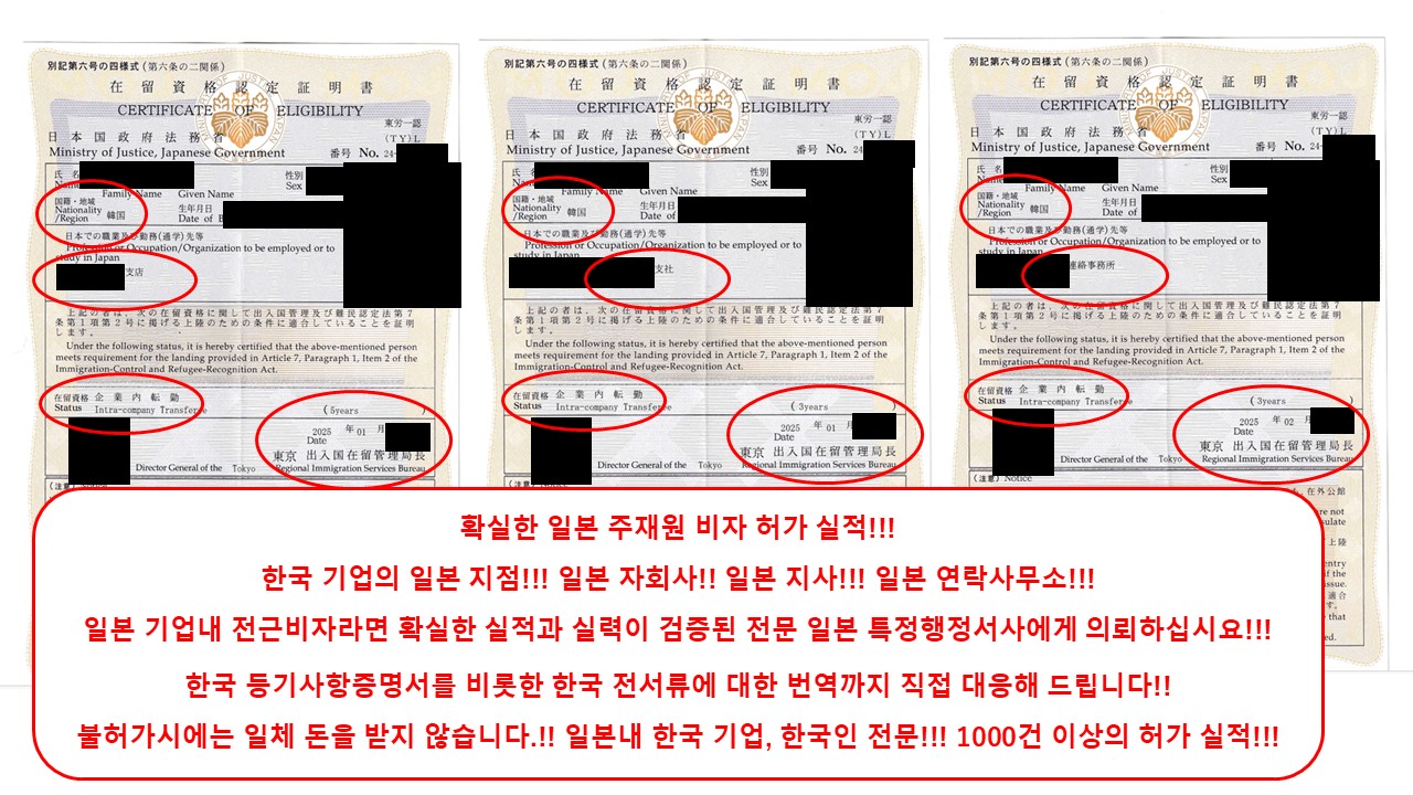 당행정서사가 도쿄 출입국재류관리국으로부터 2025년 초반에 허가를 받은 한국분들의 일본 주재원 비자(기업내 전근비자)허가 재류자격인정증명서 입니다!! (한국인의 일본 비자 허가 실적 1000건 이상!!!)
