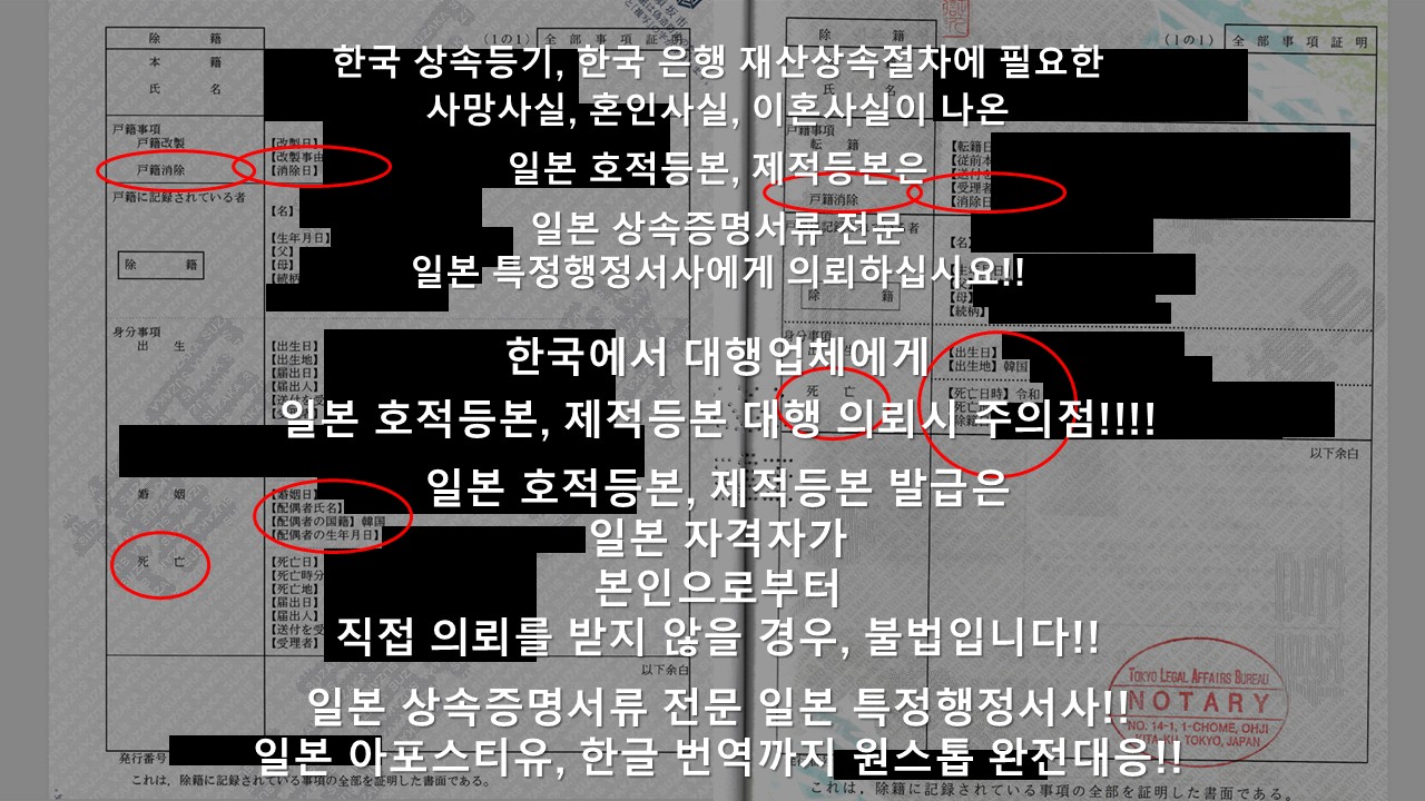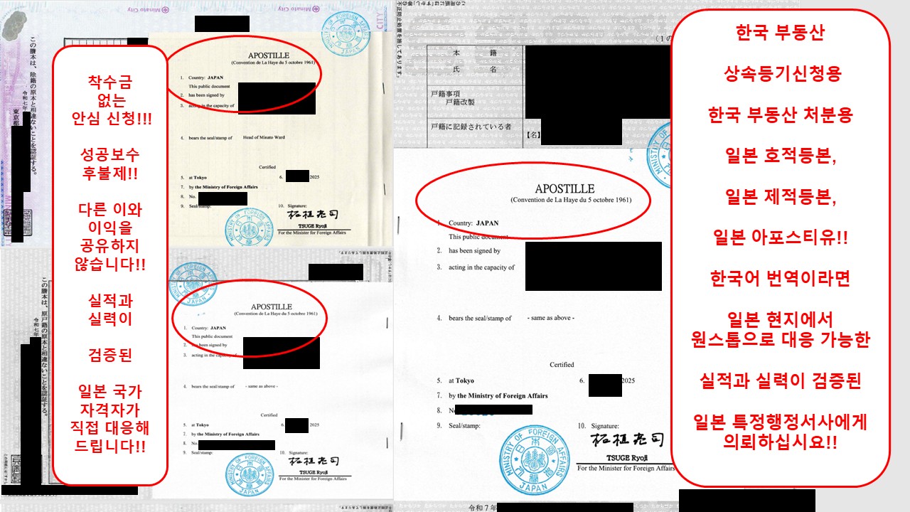 ◆ 한국 상속절차시 필요한 일본 호적등본 취득!! 일본 아포스티유 취득!! 한국어 번역이라면, 일본 현지에서 원스톱으로 대응 가능한 당사무소에 의뢰해서 실패를 예방하시길 바랍니다!! (한국 제출 일본 아포스티유 취득 실적 1000건 이상!!)