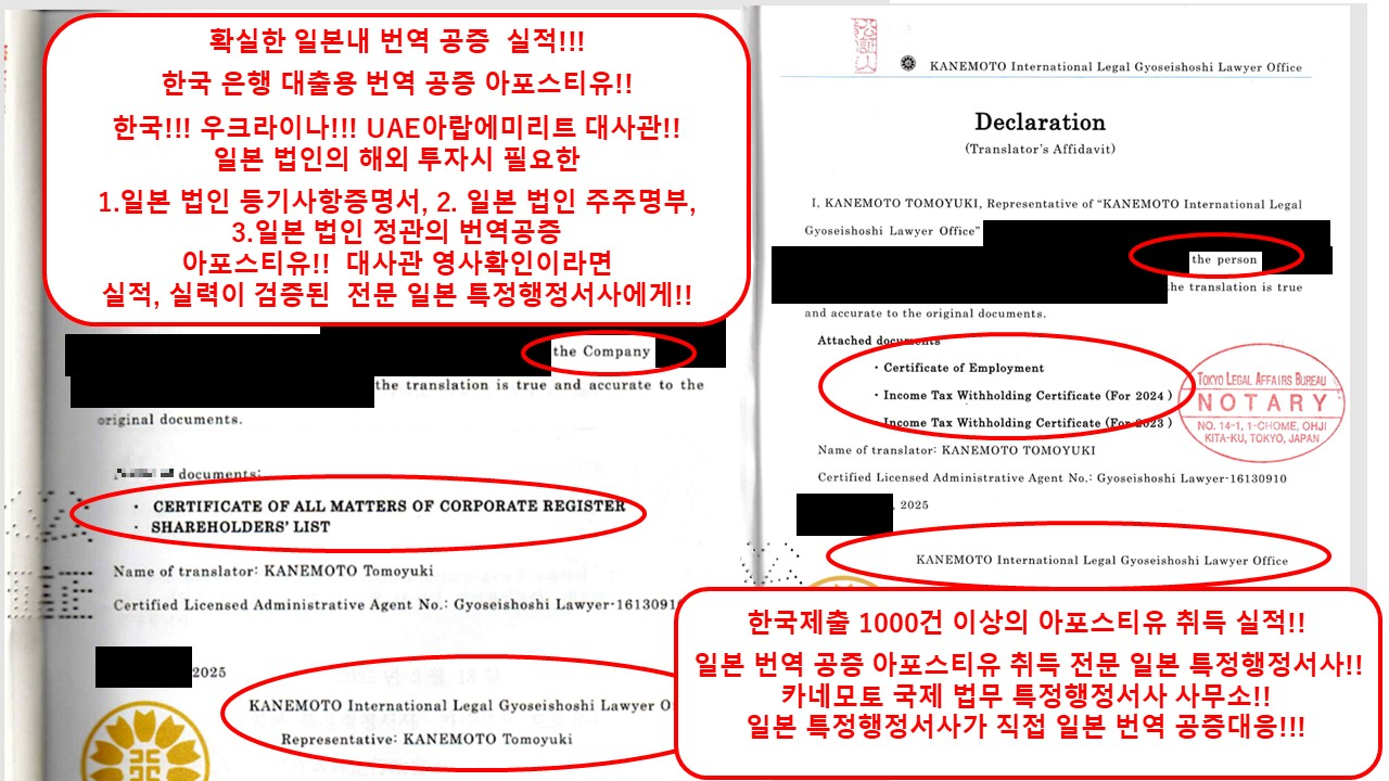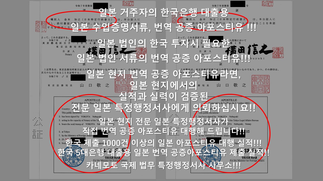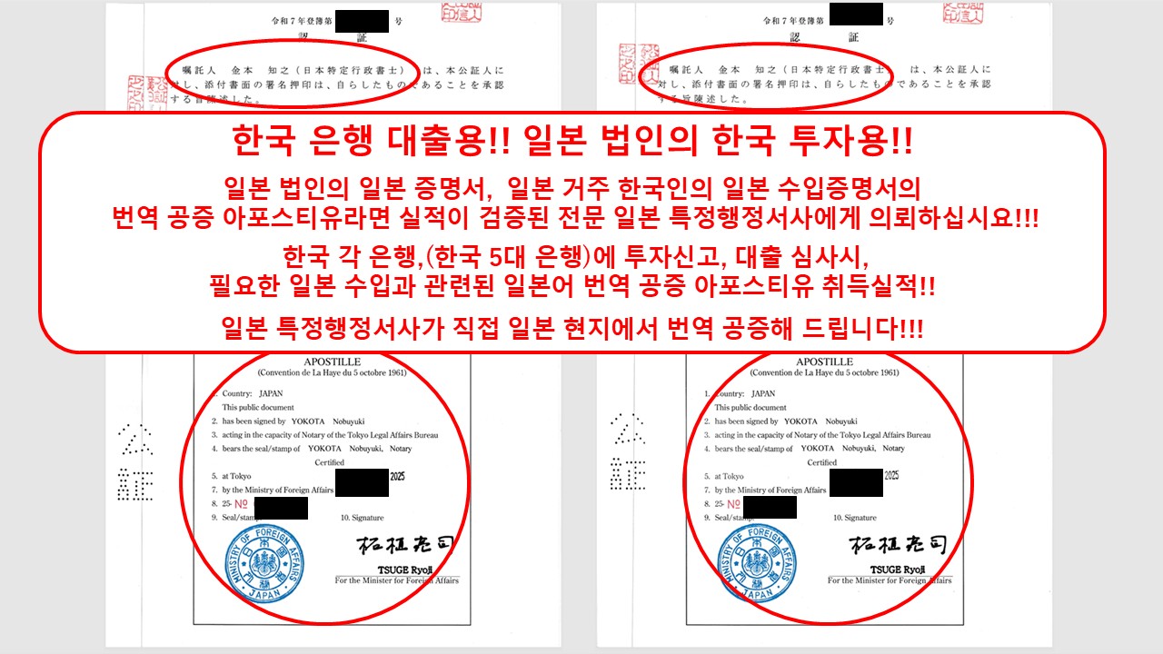 한국 제출 일본 아포스티유 취득실적 1000건 이상!!!, 한국 5대 은행을 포함한 한국 은행 제출용 번역공증 아포스티유 취득 실적 다수!!! 일본내 번역 공증, 아포스티스티유 취득 실적과 실력이 검증된 한국어가 모국어인 경험 풍부한 전문 일본 특정행정서사!!