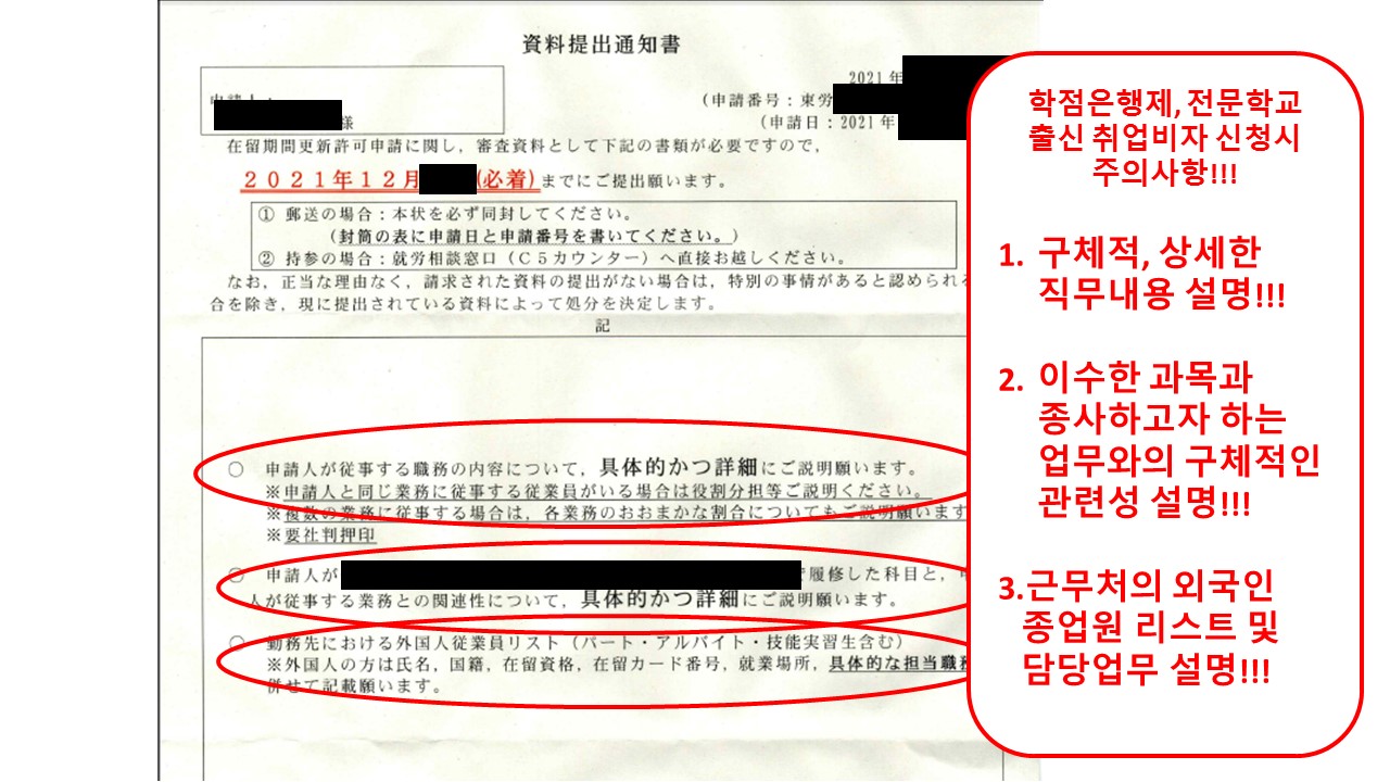 2021년도 도쿄 출입국재류관리국 취로심사과에서 통지된 추가서류 제출 통지서입니다.