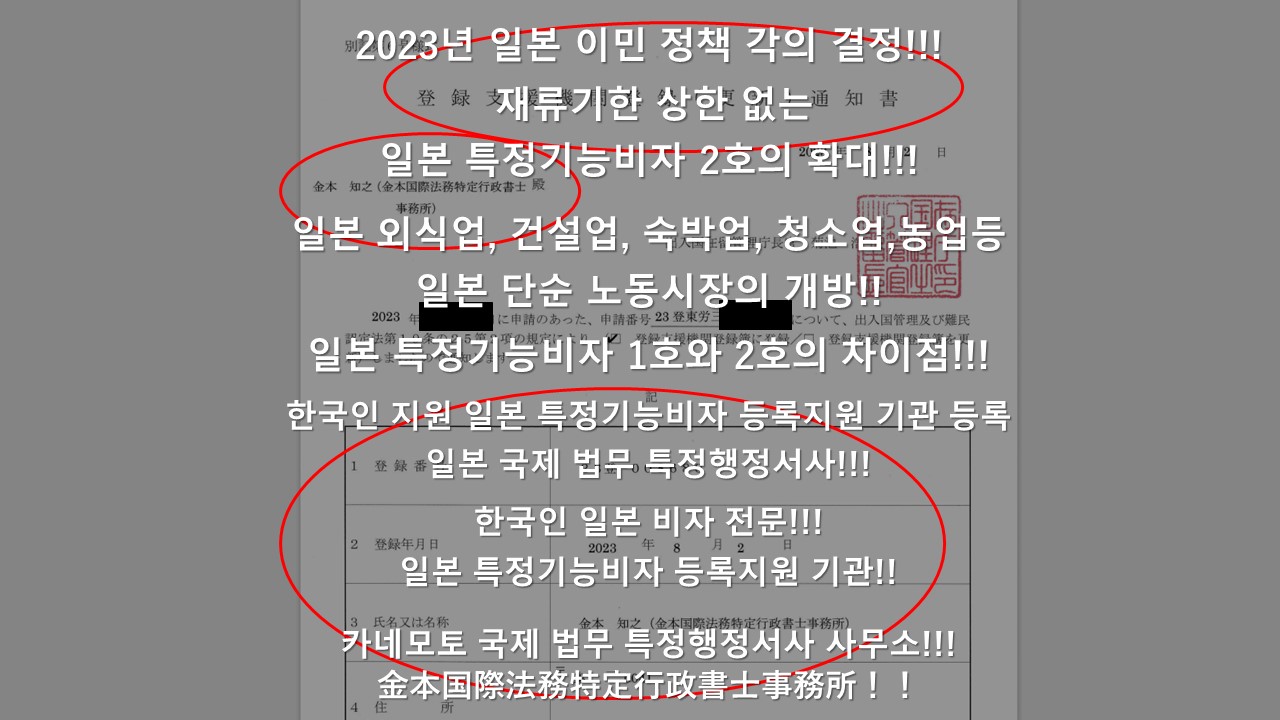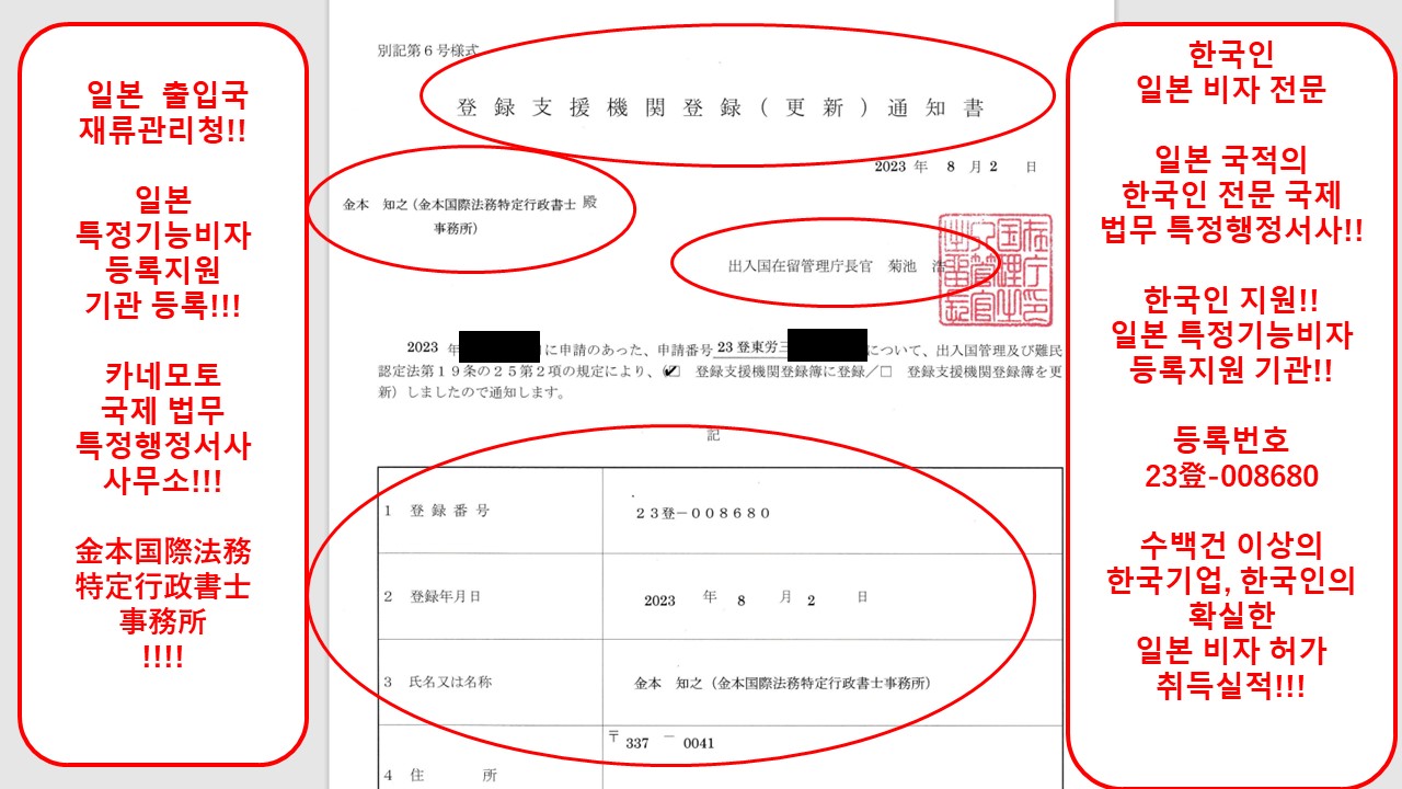 ◆당사무소는 일본 출입국재류관리청에 등록된 정식 등록지원기관이며, 한국인의 일본 특정기능비자를 서포트해 드릴수 있습니다. (일본 출입국 재류관리청 등록지원기관 등록번호 23登-008680)