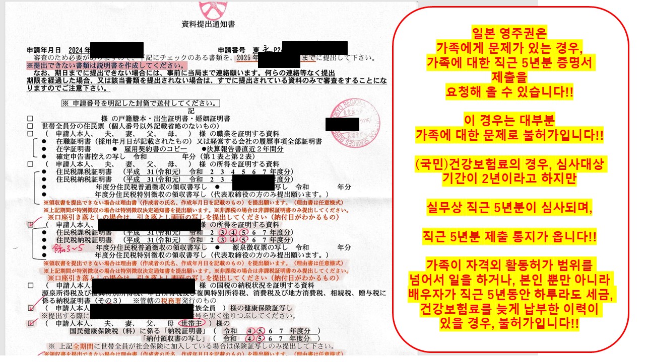 일본인 또는 영주자와 결혼한 분의 경우는 가족에 대한 직근 3년분 증명서 제출을 요청해 올 수 있습니다!!